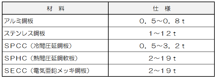 材料もアルミ鋼板、ステンレス鋼板、冷間圧延鋼板(SPCC)、熱間圧延鋼板(SPHC)、電気亜鉛メッキ鋼板などに対応してい